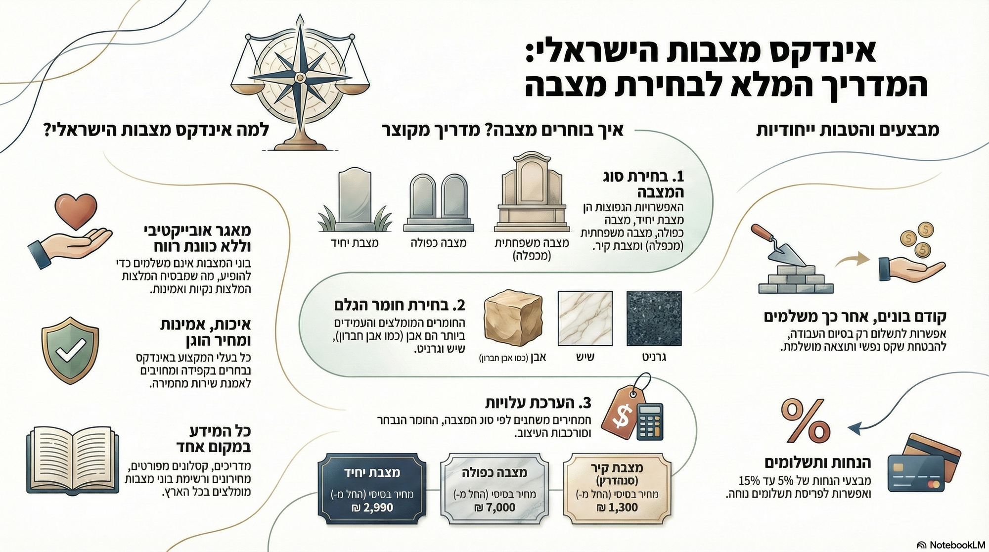 באינדקס מצבות הישראלי ניתן למצוא שירותי בניית מצבות חדשות, שיפוץ מצבות קיימות, תיקון, ניקוי וכיתוב למצבות, לצד מידע מקצועי, סגנונות עיצוב וחומרים. האינדקס נועד לחסוך זמן, למנוע טעויות ולאפשר פנייה ישירה לבוני מצבות איכותיים ומומלצים.